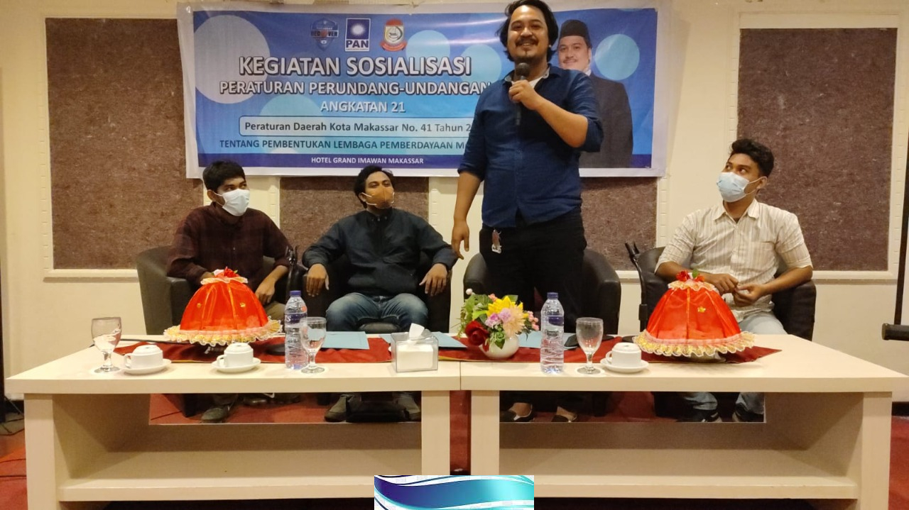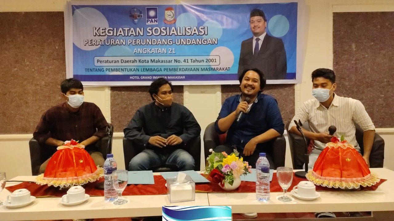 MAKASSAR – Anggota DPRD Makassar Syukran Kahfi menggelar sosialisasi penyebaran produk hukum daerah Kota makaasar Perda Nomor 41 Tahun 2001 Tentang Pembentukan Lembaga Pemberdayaan Masyarakat, di Hotel Grand Imawan, pada Kamis (9/12/2021).
