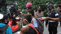 Brimob dan Marinir Bagikan Makan Siang dan Masker di Makassar