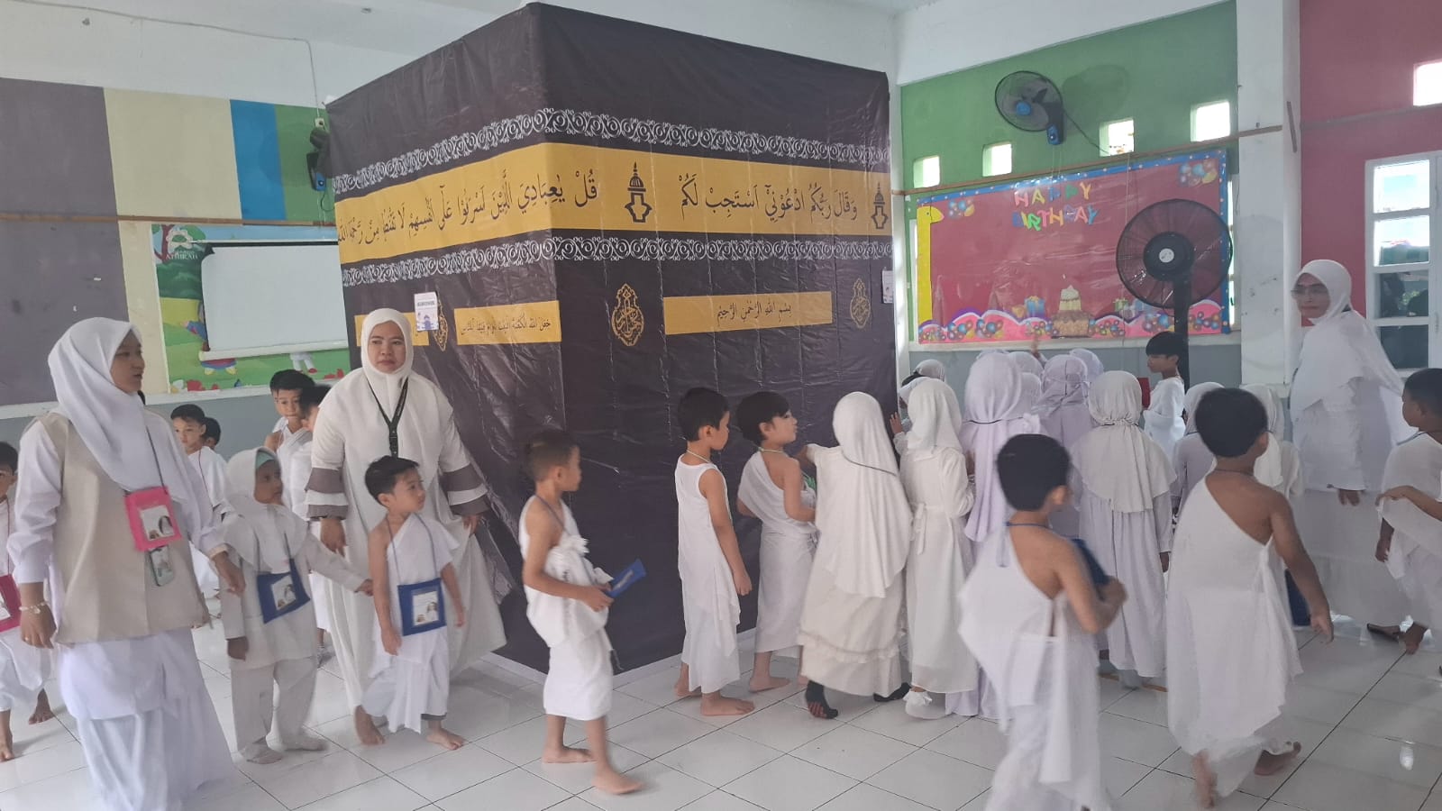 Selain mengenakan pakaian ihram, guru juga menghadirkan replika Ka’bah di halaman sekolah. Hal ini bertujuan agar anak didik dapat memahami dan merasakan langsung pengalaman ibadah haji secara lebih nyata dan menyenangkan.
