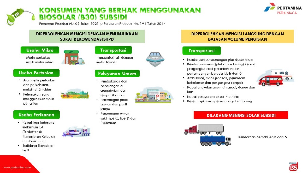 Area Manager Communication, Relations, & CSR PT Pertamina Patra Niaga Regional Sulawesi, Laode Syarifuddin Mursali menjelaskan bahwa secara regulasi penyaluran BBM jenis Solar Subsidi ini telah diatur melalui Peraturan Presiden Nomor 69 Tahun 2021 sebagai perbaruan atas Perpres No. 191 tahun 2014 tentang Penyediaan, Pendistribusian dan Harga Jual Eceran Bahan Bakar Minyak.