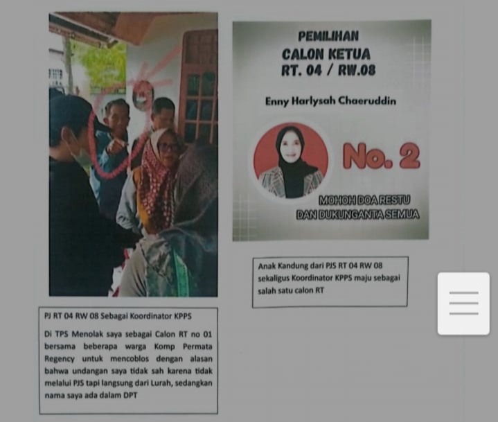 “Kami punya bukti video. PJS RT tidak bersikap netral dan ikut mengarahkan warga untuk memilih anaknya,” tulis Dewi dalam aduannya.
