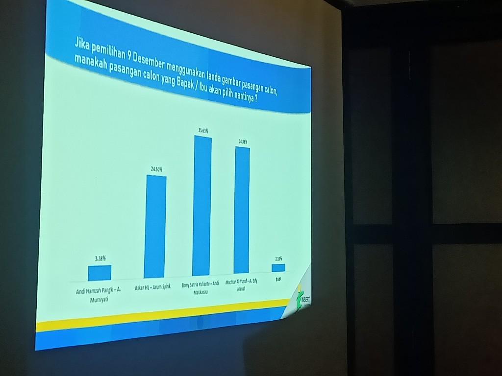 “Jika dilakukan pemilihan pada 9 Desember maka Tomy Satria Yulianto-Andi Makkasau unggul, disusul oleh Andi Muchtar Ali Yusuf-Andi Edy Manaf dengan perbedaan suara yang cukup tipis,” ujar Direktur Riset dan Data Insert Institude Reskiyanti, saat rilis di Makassar, Senin (30/11/2020).
