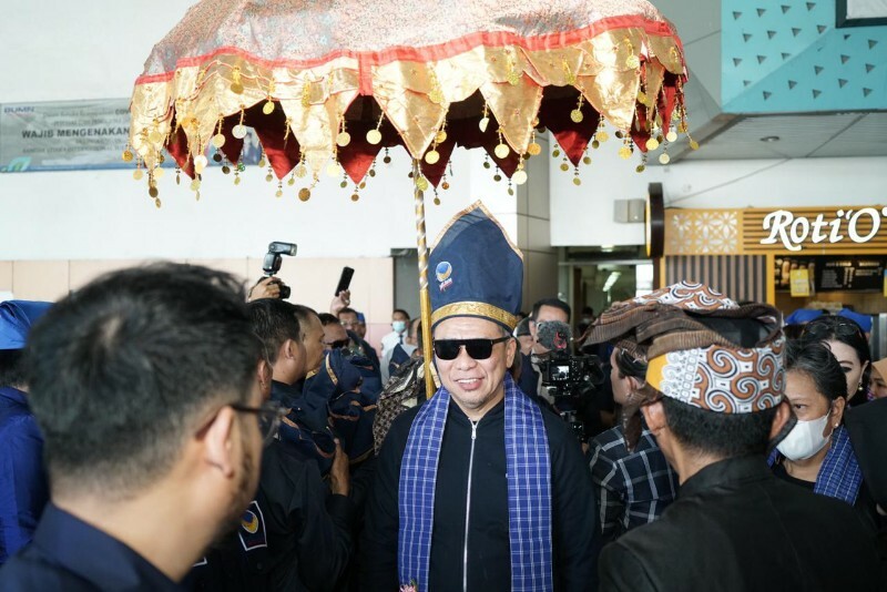 Elite DPP NasDem saat tiba disambut dengan ritual adat Bugis Makassar di kalungi sarung.