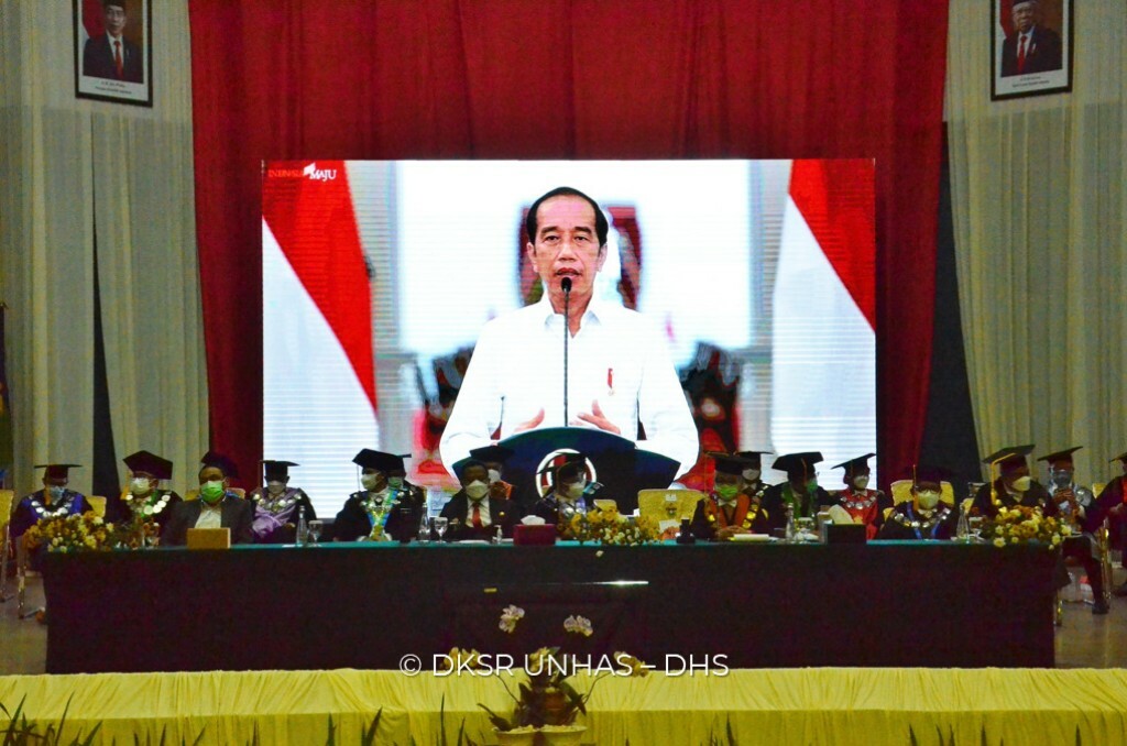 “Peran Unhas dalam memperkokoh humanisme menjadi pemantik lahirnya banyak kepedulian dan solidaritas. Menjadi inspirasi untuk banyak orang dalam berbagai aksi kemanusian dan ikut terlibat terhadap berbagai permasalahan bangsa,” jelas Joko Widodo.