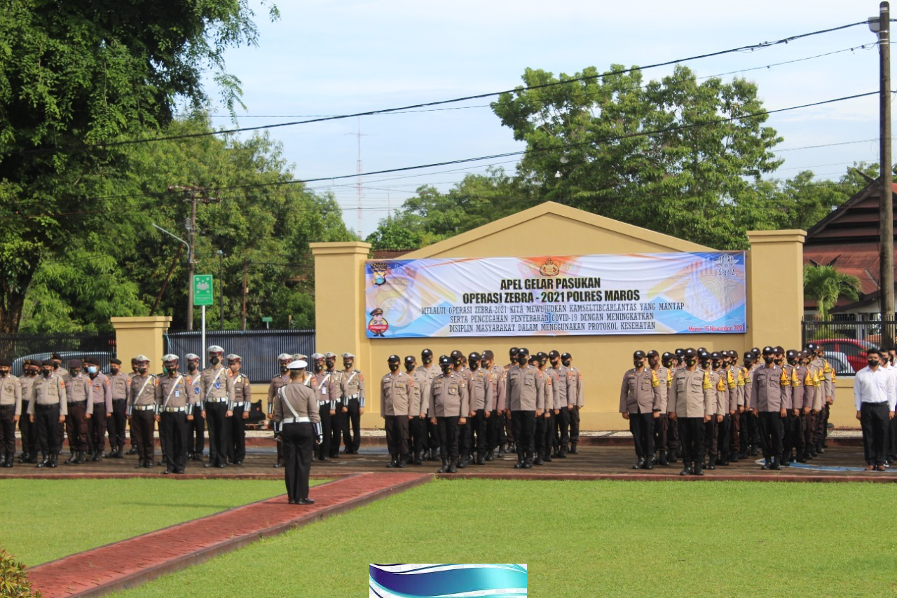 Kapolres Maros AKBP H.Fatchur saat memimpin Apel gelar pasukan mengatakan Operasi Zebra Polres Maros tahun 2021 bertujuan mewujudkan Kamseltiblancar yang mantap serta pencegahan penyebaran Covid-19 dengan meningkatkan Disiplin masyarakat dalam menggunakan protokol kesehatan.