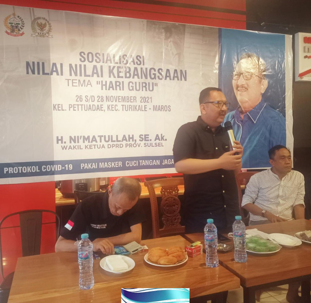 SulselExperience com, Maros – Wakil Ketua DPRD Provinsi Sulawesi Selatan, H.Ni’Matullah,.SE,Ak. kembali melaksanakan tugasnya sebagai wakil rakyat dengan mensosialisasikan nilai-nilai kebangsaan bertema “Hari Guru” yang dilaksanakan pada tanggal 26 s/d 28 November 2021.